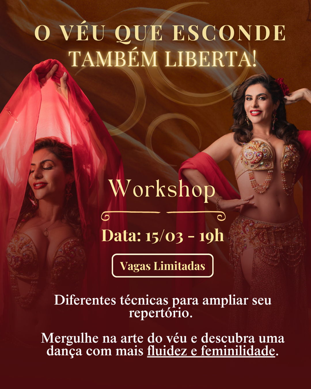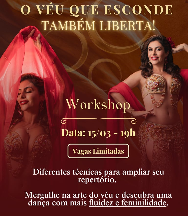 Exemplo atual: Workshop "O Véu que Esconde Também Liberta" — mergulhe na arte do véu e descubra uma dança com mais fluidez e feminilidade.